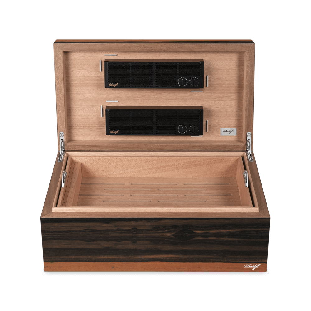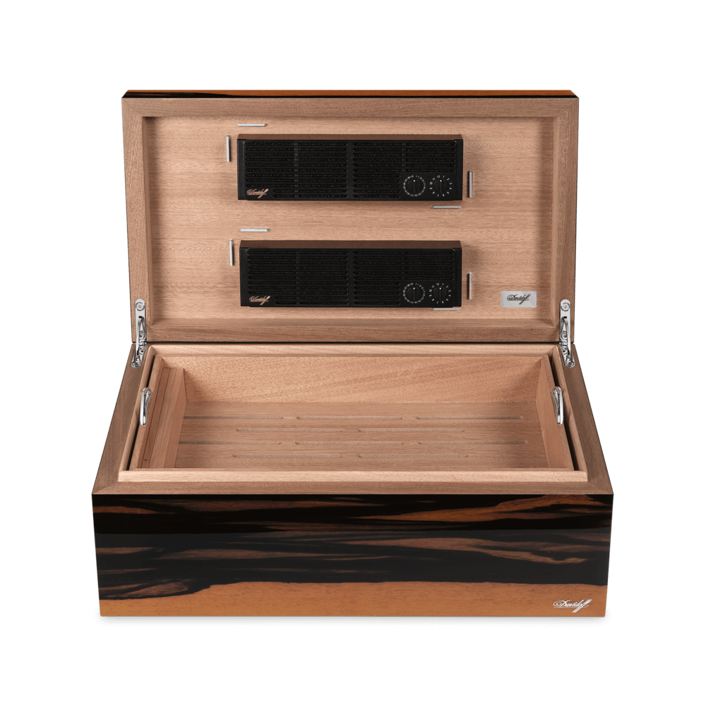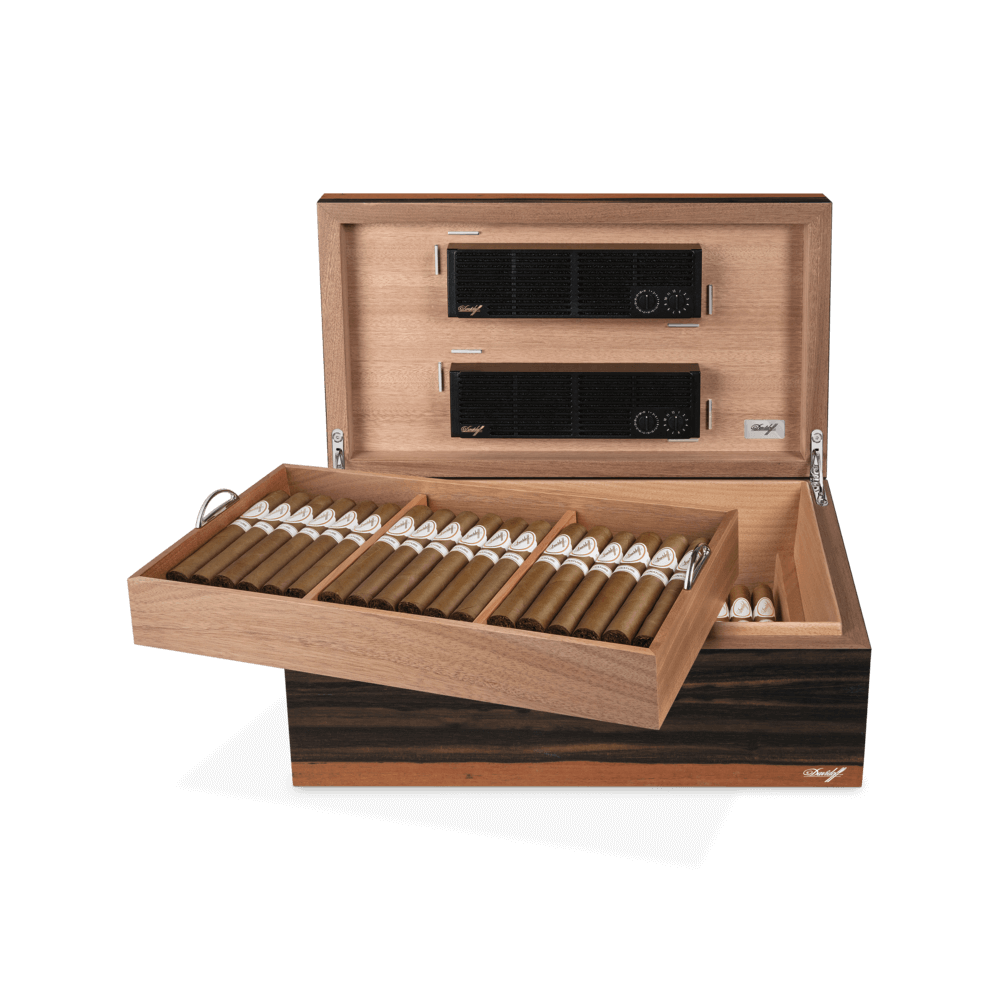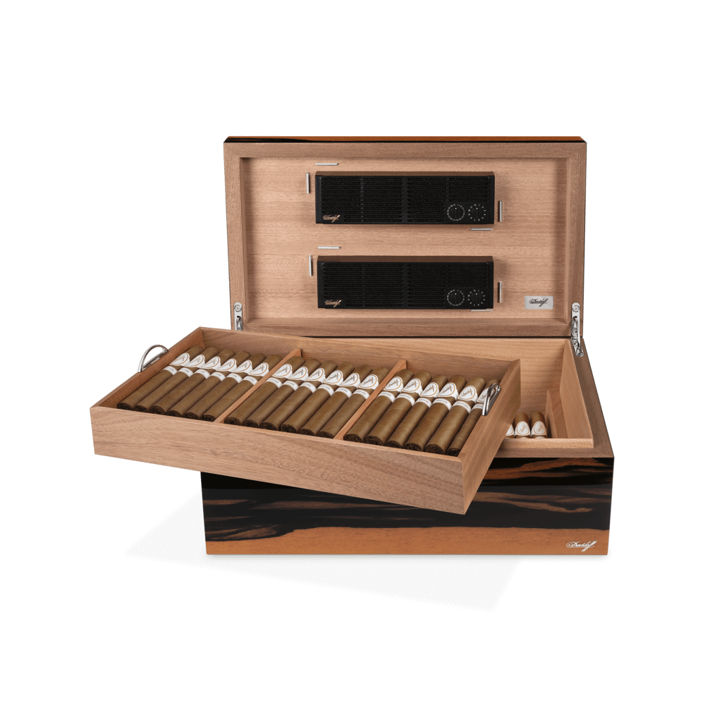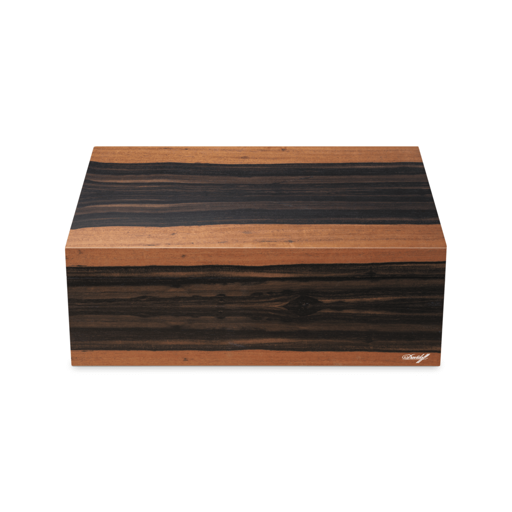 The Davidoff Grande Humidor is a striking synthesis of natural elegance and artisanal precision – its name a bod to both its impressive capacity and the grandeur of its craftsmanship. Handcrafted in Italy from Gaboon ebony and okoumé wood and distinguished by its generous proportions, this refined humidor offers a secure and spacious home for up to 140 cigars.